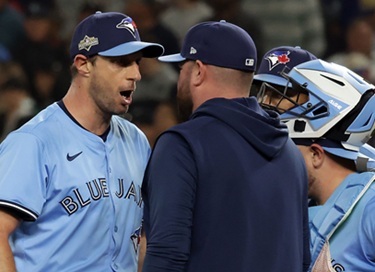“Blue Jays pitcher Max Scherzer had a memorable “Mad Max” moment with his manager in the American League Championship Series. Steve Russell/Toronto Star/Getty Images.