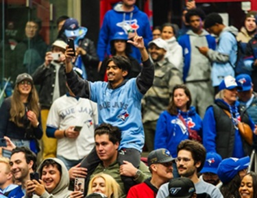 “Toronto Blue Jays fans celebrate after the team beat the Seattle Mariners to win the American League Championship Series, in Toronto, Tuesday, Oct. 21, 2025. THE CANADIAN PRESS/Laura Proctor,”